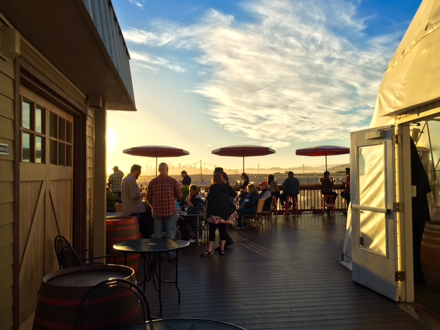 As you walk up to the tasting room at Rock Wall, you may catch a glimpse of what is beyond the building on the other side, and if you’ve timed your visit just right for later in the afternoon–approaching sunset–get ready to enjoy one of the most underrated views in all of the Bay Area. But First! Start your visit with a tasting inside, or a glass of half-priced wine at happy hour. Once you choose the wine you would like to sip for a while, exit through the back of the building and prepare to be stunned by how beautiful the city of San Francisco looks directly across the Bay; peaceful and silhouetted in all its crazy glory. Rock Wall is perfectly situated on this heavily industrial concrete park, with the most incredible panoramic views of the whole San Francisco Bay area– with the Bay’s namesake city protruding from the water in the distance. There are few places in the East Bay area that can boast a better view. How lucky that we are able to enjoy this unbelievably unique Bay Area view on our urban winery tour.