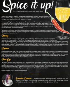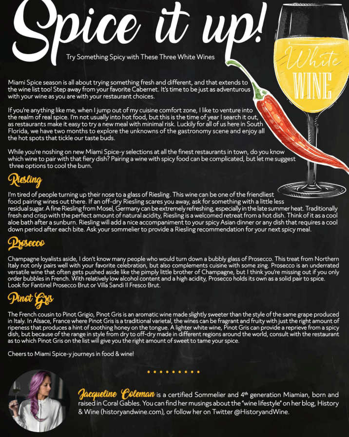 So how are you “spicing up” your wine selection this year? Check out a few of my suggestions for your next Miami Spice-y meal! Cheers!