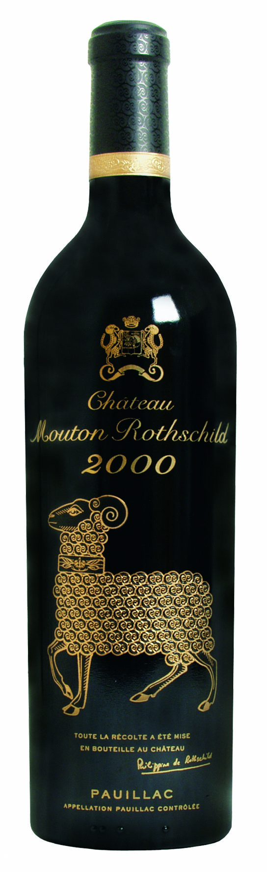 In 2000, Baroness Philippine did not commission an artist to design the chateau’s label. Instead, the bottle itself became the work of art. The high-quality heavy glass bottle features the “Augsburg Ram” created by German master goldsmith Jakob Schenauer in 1590. To make this work possible, the glassmaker created a new technique for enameling glass in relief, involving a method for firing the gold and enamel to produce a unique texture.